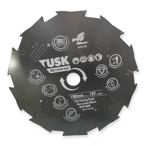 To combat the highly abrasive properties of laminate, bamboo, hard decking timber flooring (that immediately dulls the cutting edge of standard blades), each tooth is tipped with Polycrystalline Diamond (PCD) and spark eroded to create a triple chip tooth Geometry (TCG) resulting in a dramatically improved cutting edge. Our PCD blades feature a thin kerf design that requires less cutting power, making them ideal even for underpowered saws at the worksite. Also featuring a non stick coating which reduces gumming, friction and the destructive effects of heat build up. Anti kickback design feature reinforces the tooth and prevents over feeding of material during cuts.